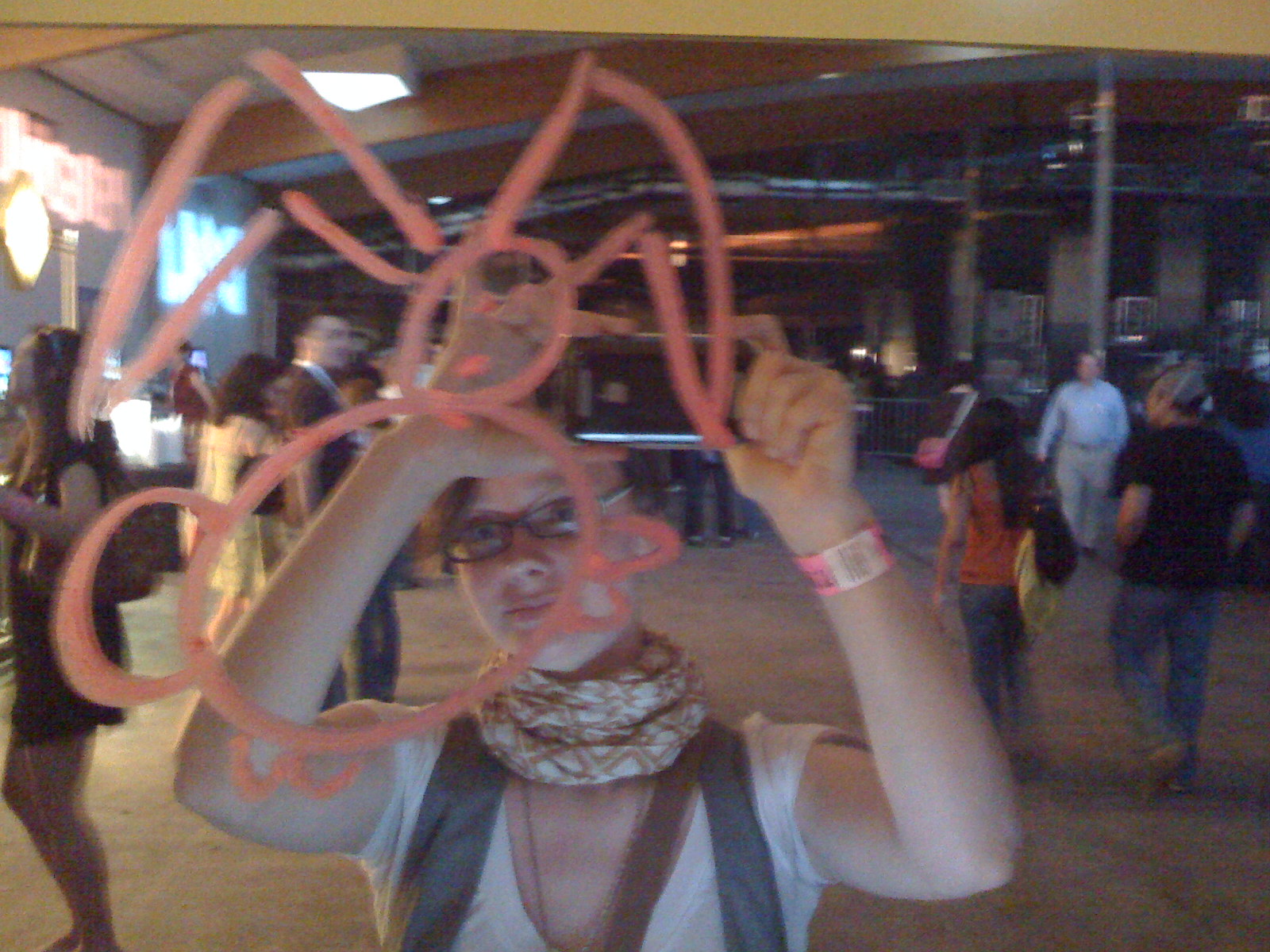 We met outside of the venue–an old Safeway lot that was serving as the secret party locale for most of SXSW’s exclusive parties (the Playboy party was also there). Inside the warehouse-like space, there were two bars (free booze is the calling card of these invite only SXSW parties,) including a Cognac sno-cone machine, a huge stage, a wall with mirrors (and bowls of pink lipstick for writing on them), and a swing set playground on a large patch of AstroTurf. Perez Hilton came out to introduce each band in an outfit of head to toe pink, including a glittery headpiece (think Barbie with a Viking theme).