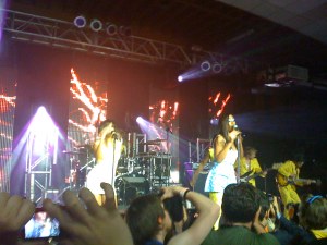 So around this point in the night, Perez Hilton comes on stage to tell us that Lady Sovergien (who new friends and I saw come into the venue and go into the VIP room–I lost all my New York cool and shouted “Wooooooooo!” when she walked past. Note to self: work on that.) has said she’s too sick to perform. He calls her the c-word (my inner feminist bristles) and says he can talk trash on her because that’s what he does. Disappointing, sure, but it’s all good by the time the next act comes out–Rye Rye.