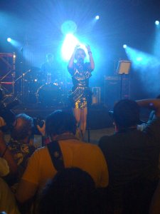 Just when the night could’ve begun to look like a girl-with-guitar fest, Perez Hilton introduced Thunderheist, a hot rapper from–of all places–Canada. She rhymed and rapped in a deep throated Missy Elliot-esque voice, with fierce beats behind her, a magnet of charm and cool as she sassed her way along, bounced around the stage, and made us all dance so hard that by the time it was over, I looked like I had just been in a wet t-shirt contest.