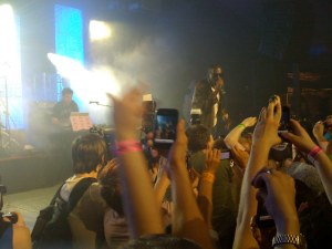 Oh, snap, indeed. The entire crowd surges towards the front of the stage. (I’m sandwiched between friend of new friends and a girl and her boyfriend). iPhones are crowding the space above our heads. Flashes are going off like crazy. I have one Kanye album, from my days of an 8th grade Special Educator in the South Bronx (oh, if those kids could see me now). Do I like that Kanye has said things like that we should give Chris Brown a break? Hell no. Do I like the five or so new songs he performs, reaching into the crowd, pacing the stage, and eating the energy up? Yes, yes, yes.