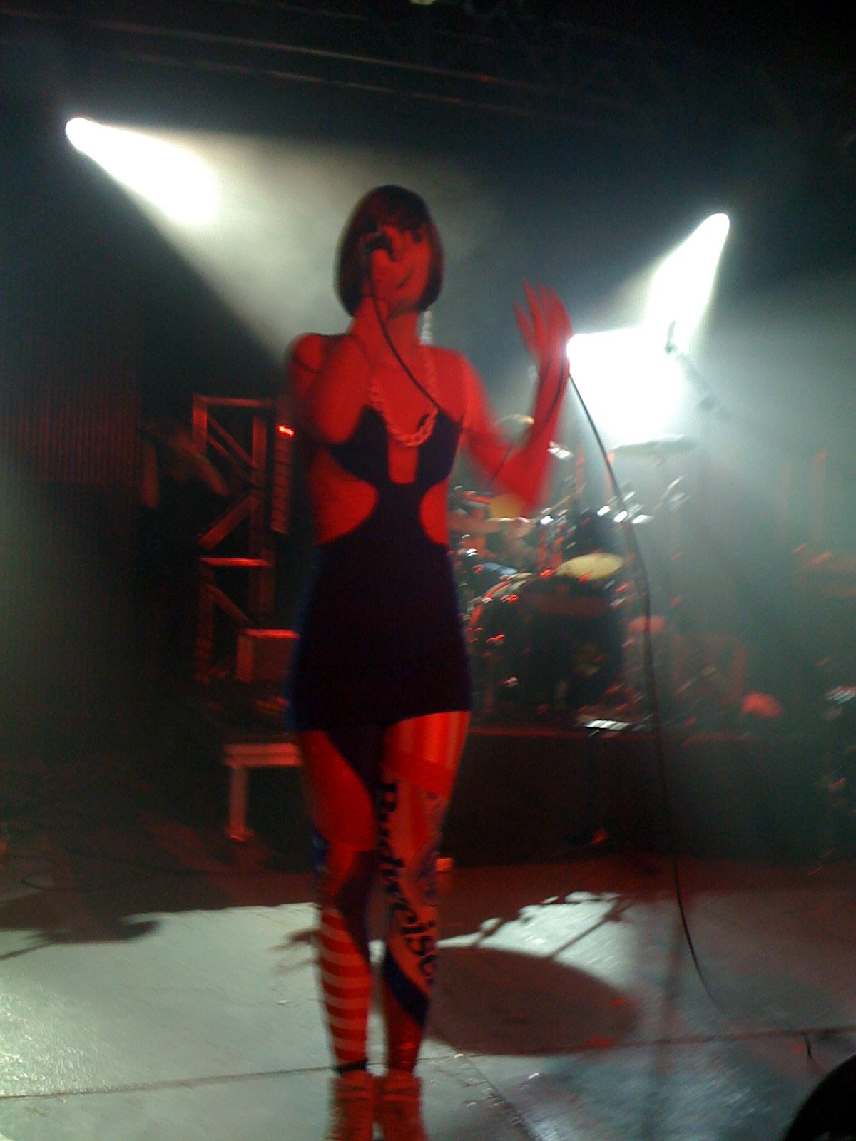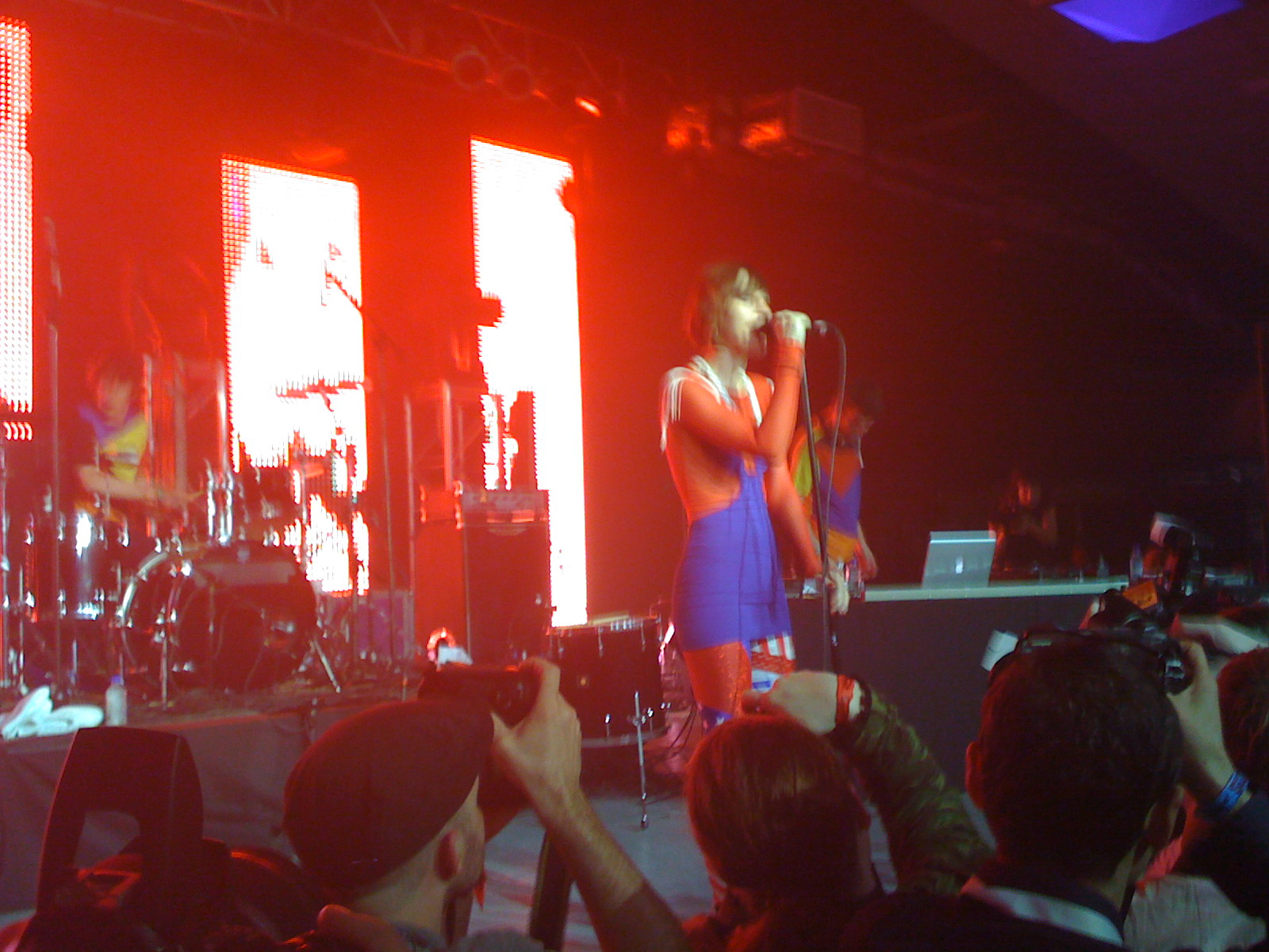 Buzz was big around Little Boots, and from what my Last.fm radio plays of her had suggested to me, she was going to be fun. A small British pop singer, known for playing her own music (imagine that!), with tracks like Meddle and New in Town, her music is smart, energetic and synth-rich pop–the kind of songs that, if the bar you’re at on a Saturday night are playing at the beginning of the night, you can count on it being a good time. She’s super charismatic (I’ve since been charmed by her twitter account of zipping around to photo shoots and gigs) and fun to watch. New friends and I had a ball dancing around to her. Perez wrapped up her act by bringing Kid Cudi (a talented newbie on the hip hop scene) out, asking them to do an impromptu duet of the cover Little Boots had done of Kid Cudi’s song Day N Night. The gift of being at an exclusive celebrity blogger’s party–impromptu duets. Pinch me.