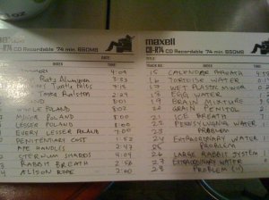 this is a fake track list on a fake album by my friend p (not fake). we reveled in its brilliance while waiting for our order at crif dogs. it was my first time, which meant indulgence in tater tots and an epiphany about where the magnet of a girl riding on a hot dog in my third apartment came from.
