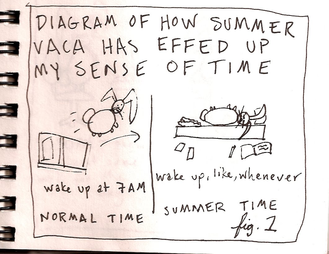 two weeks into my vacation, and i have lost all sense of time. is it tuesday or friday? when did i go to bed last night? can i still order a bagel at 3pm? i feel like i have eleven months of pent up young urban night owl lifestyle coming through.